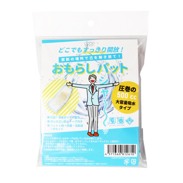 開放的な気持ちで全てを解き放て!禁断の願いを実現する「おもらしパット」でいつでもどこでも’おもらし’が可能です。 圧巻の500cc大容量吸水タイプなので多い日も安心。 安心のズレ防止テープ付きで下着のセットも楽々。 ストレス社会に必要なのは大胆な開放感だとCOOLPは強く主張します。 【使用方法】 1パットを開きズレ止めテープの付いている方を前にします。 2ズレ止めテープを剥がし下着(ボクサーパンツまたはトランクス)に貼付け尿を吸水できる位置にセットしてください。 3下着を引き上げズボンを履いてください。 4使用後は付属の抗菌・消臭袋に入れて廃棄します。 ※パッケージのデザイン・サイズは予告なく変更される可能性がございます。 ※商品破損、部品不足等の初期不良品については、パッケージ等に記載されているメーカーのサポートセンターにご連絡ください。記載されていない場合は、当社までお問い合わせください。